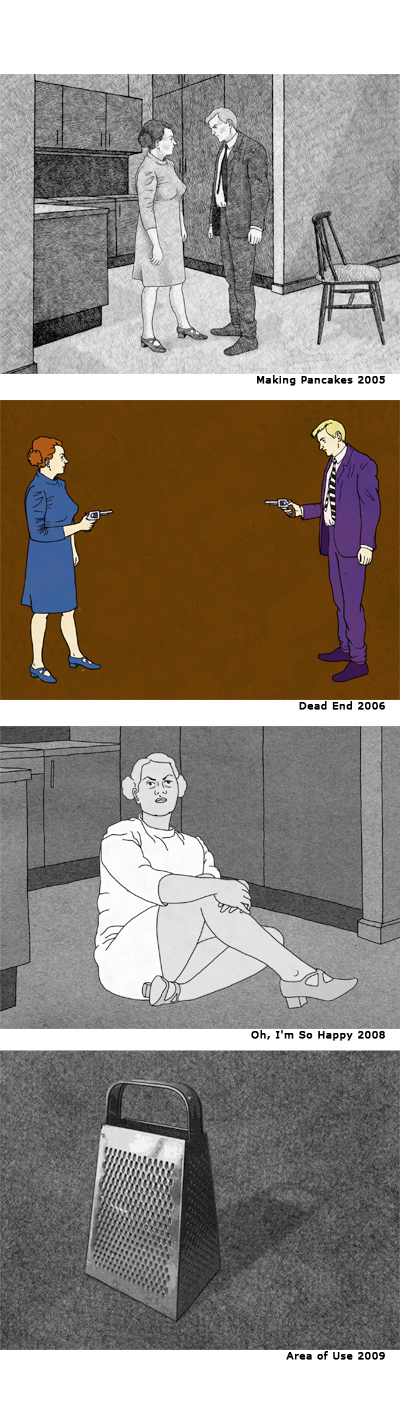 Making Pancakes 2005 "Making Pancakes" is an animated video, showing a woman and a man in a totally unbalanced relationship. At times we see a seemingly everyday course of events, and other times they are in a more threatening situation. The man is filled with self-satisfaction and yet he shines from an uncertainty and a longing for acknowledgement. The woman acts in a numb and routine way, doing all she can to uphold the façade. By changing the standard and placing the domestic violence outdoors, where it’s visible, and the upholding of the perfect façade hidden behind the closed doors of the home, the absurdity of this behavior is revealed. The trivial mistakes while making dinner serve as the catalyst of the violent outrages. Dead End 2006 The video “Dead End” is an animated illustration of a completely locked situation, without a chance of finding the solution. The imagery in the video is quite static and is primarily created to turn the focus to the dialogue. The two characters in the video, a woman and a man, act as eachother's opposites, both ready for the fight. Even though there is a clear dialogue between the two parts, they are unable to communicate. Of course, this creates no winner, but the result is rather two powerless losers. “Dead End” works as a reflection of the society in which we live today. Oh, I'm So Happy 2008 "Oh, I'm So Happy" is an animated video where we meet a middle-aged woman who is living in total isolation, with an extreme loneliness as a result. The woman performs a monologue, in which she tries her best to convince us about how happy and content she is with her present situation. However, her attempt is totally shallow and transparent. Area of Use 2009 The video "Area of Use" is an illustration of a housewife's inner thoughts about alternative ways of using her most common working tools. It is also a manifestation of a sealed existence that exposes a mind which gives a sense of being trapped in a treadmill. This work is closely related to the video "Oh, I'm So Happy". Four drawings: I Feel Protected Inside The four drawings form a short series of thoughts which are extracted from the video "Oh, I'm So Happy". The main intension with the drawings is to amplify the sense of this happening in more than one place. "The animations by Cecilia Lundqvist, of a very simple dramaturgy, a planar and clean drawing, present routine activities, using elements from the everyday life in order to point to some of the main problems in human relationships. By opposing mostly only two elements, in a binary system the author juxtaposes some examples of extremes, stereotyped relations or behavioural patterns: good and evil, male and female, body and soul. The reduced dynamics and monotony of the plot, as well as the tendency to repeat, merge with strong colours, mainly primary, while the sound points to the technological metamediatic origin of the realized idea. The treatment of sound (and voice, the spoken word) and its relation towards the video image is an important aesthetic element. The popular culture, mass media, film and pop art represent an important referential place in the works of this artist. The appropriation and recycling are for Cecilia Lundqvist important artistic strategies, like key words to the interpretation of her works and her creative and cognitive process. We often come across the strategy of appropriation, which exploits Hollywood. In that way Hollywood narratives are remodelled, revisited, adapted and shown in form of critical or cynical pastiches." Welcome www.geocities.com/cecilia_lundqvist/